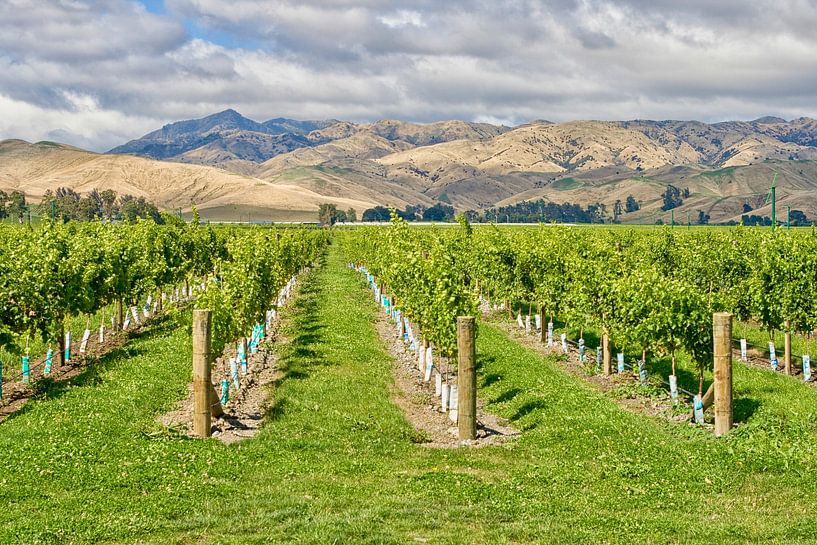 Weinberg mit Blick auf eine Bergkette in Marlborough, Neuseeland