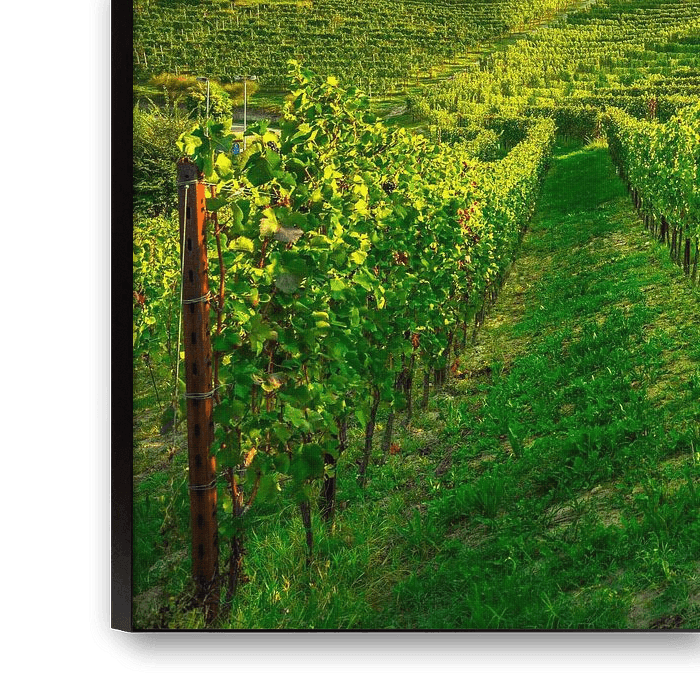 Weinberge der Langhe und das Dorf Neive im Hintergrund.