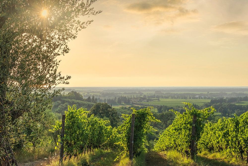 Die Weinberge von Bolgheri und ein Olivenbaum bei Sonnenuntergang.