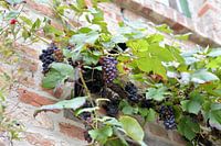 Weinrebe mit Weintrauben als Dekoration an einer Hauswand in der Altstadt von Rostock in Deutschland.