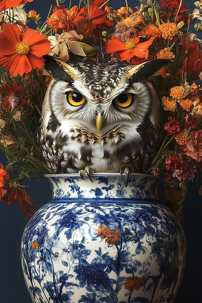Dieses Kunstwerk verbindet klassische Eleganz mit einer unerwarteten, verspielten Wendung. Eine Eule mit intensiven, leuchtend gelben Augen ist in einem üppigen Strauß bunter Blumen versteckt, die wunderschön aus einer Porzellanvase aus blauer Delfter Keramik herausragen. Der tiefdunkelblaue Hintergrund unterstreicht die Lebendigkeit der Blumen und den markanten Charakter der Eule.