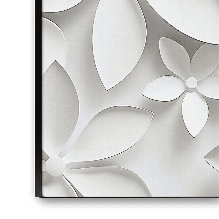Bild in 3d mit Tiefe und Schatten von weißen Blumen auf weißem Hintergrund. Es wird der Eindruck erweckt, dass sich die Blumen vom Hintergrund abheben. Schöne Verwendung der weißen Farbe in verschiedenen Nuancen. Subtil. Passt zu verschiedenen Stilen und Trends, einschließlich modern abstrakt, weiß, natürlich. Künstlerin: Bianca ter Riet