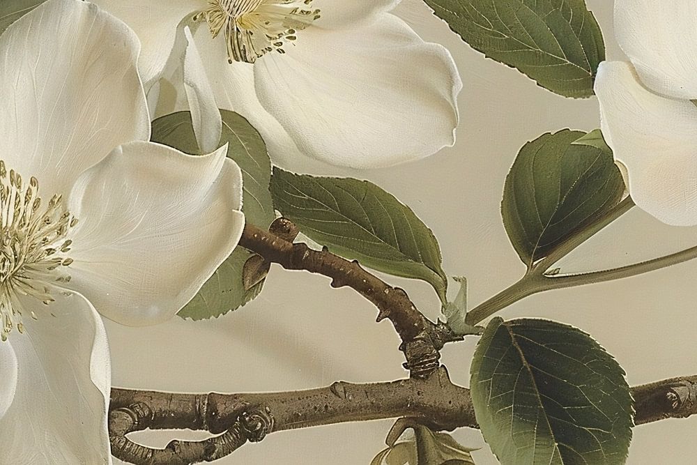 Dieses schöne Design zeigt zarte weiße Blumen, die elegant auf einem Zweig vor einem dezenten beigen Hintergrund blühen. Die detaillierte Darstellung der Blumen und Blätter schafft eine ruhige und anspruchsvolle Atmosphäre, die perfekt für einen ruhigen Raum wie ein Schlafzimmer oder ein Büro ist. Das klassische und realistische Kunstwerk fängt die natürliche Schönheit von Blumen in ihrer vollen Blüte ein, wobei die monochrome Farbgebung für einen zeitlosen und eleganten Look sorgt. Dieses Design ist ideal für Liebhaber von Natur und klassischer Kunst und bringt einen Hauch von Natur und Gelassenheit in jedes Interieur.