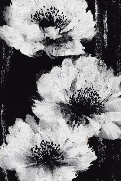 Ein vertikales botanisches Motiv mit drei großen, weißen, mohnblumenähnlichen Blüten. Die strukturierten weißen Blütenblätter heben sich deutlich von dem tiefschwarzen Hintergrund ab und werden durch vertikale, strukturierte Texturen und dunkle Blütenmitten akzentuiert. "rain"