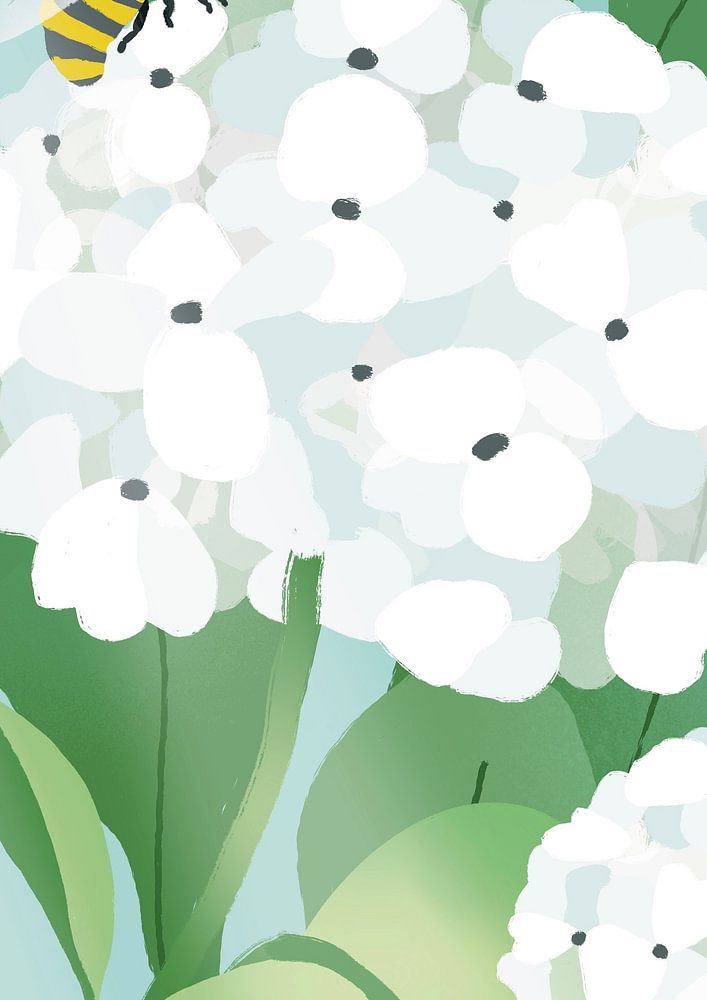 Digitale Illustration von weißen Hortensien mit einer Biene. Im Hintergrund sind grüne Blätter zu sehen. Ruhige, aber lebendige Farben werden verwendet.