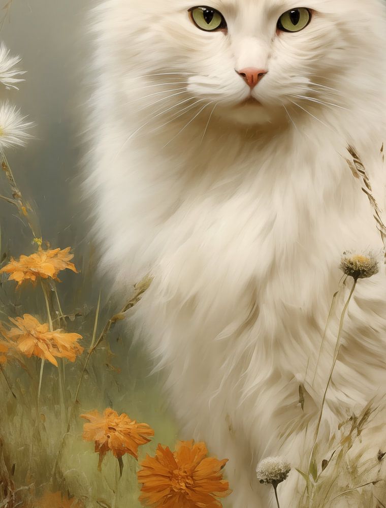 Dieses heitere Bild zeigt einen stattlichen weißen Kater, der in einem üppigen Blumenfeld sitzt, das von weißen bis zu orangefarbenen Blüten reicht. Das flauschige, schneeweiße Fell des Katers steht in einem schönen Kontrast zu den natürlichen Farben der Blumen und des Grases um ihn herum. Seine durchdringenden grünen Augen blicken geradeaus und verleihen ihm einen geheimnisvollen und ruhigen Blick. Die Kombination aus dem verträumten Licht, das durch die Blumen fällt, und dem ruhigen Auftreten der Katze schafft eine Atmosphäre des Friedens und der Harmonie. Die orangefarbenen Blumen verleihen der Szene einen warmen Glanz, während die zarten weißen Blumen dem Bild einen Hauch von Sanftheit verleihen. Dieses Kunstwerk fängt perfekt die zeitlose Schönheit der Natur und die Anmut der Katze ein, die in einem Moment der Stille und Besinnung zusammenkommen.