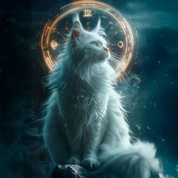 Bestelle das digitale Kunst Bild Weiße Mystische Katze – Runenzauber im Mondlicht von Erika Kaisersot als Reproduktion auf Leinwand, Alu-Dibond, als Poster, Fototapete oder Acrylglasbild.