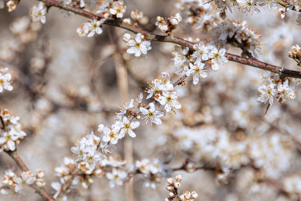 Weiße Schlehenblüten bieten reichlich Nahrung für Bienen, Hummeln und andere Insekten. Gesehen bei einem Spaziergang an der Trave.