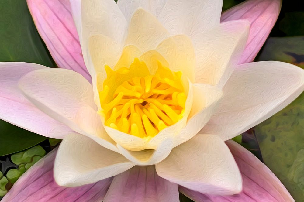 Weiße Seerose inmitten von grünen Blättern mit Ölgemälde