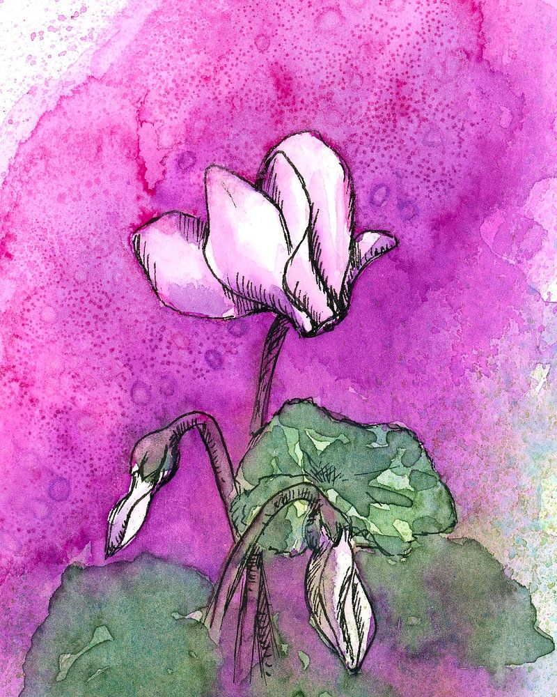 Weißes Alpenveilchen auf Rosa ist eine Zeichnung mit schwarzer Tusche einer wunderschönen blühenden weißen Alpenveilchen-Blume mit Blüten und Knospen, die mit lebendigen Aquarelllavierungen coloriert ist. Die strahlend weißen Blüten haben einen leichten Hauch von Pink, deshalb habe ich als Hintergrundfarbe ein kräftiges Pink gewählt. Die dunkelgrünen Blätter lassen die brillanten Blüten noch heller erstrahlen. Als Zimmerpflanze blühen diese schönen zarten Blumen hauptsächlich in der Wintersaison. Aber einige dieser Pflanzen wachsen auch im Garten und erfreuen uns im Sommer mit ihrer Schönheit in Weiß-, Rosa-, Lila- oder Tiefrottönen. 156