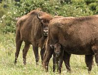 Ein Wisentkalb schaut neugierig unter den Bauch seiner Mutter im Naturschutzgebiet Slikken van de Heen in Sint Philipsland in der Provinz Zeeland in den Niederlanden. Das Gebiet wird von Het Zeeuwse Landschap verwaltet.