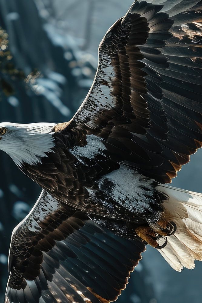Ein Weißkopfseeadler durchschneidet den Himmel zwischen schneebedeckten Bergen, eingefangen in einem atemberaubenden Panoramafoto. Die zerklüftete Landschaft wird von spitzen Gipfeln dominiert, die in eine weiße Decke gehüllt sind. Der Weißkopfseeadler scheint mit seinen weit ausgebreiteten, mächtigen Flügeln fast mit dem Wind zu tanzen. Sein Gefieder glitzert im Sonnenlicht und bildet einen lebhaften Kontrast zum eisigen Hintergrund. Die Berge erheben sich wie Wächter der Natur, und hier und da trotzen Fichten der Kälte. Das Foto strahlt eine raue Pracht aus, in der der Weißkopfseeadler zwischen den schneebedeckten Berggipfeln wie ein Zeuge der Freiheit aufsteigt, ein Moment wilder Anmut in der ungezähmten Natur.