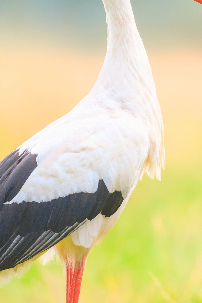 Weißstorch (Ciconia ciconia) Vogel mit ausgeprägten weißen und schwarzen Federn, der im Sommer auf einer Wiese nach Nahrung sucht.