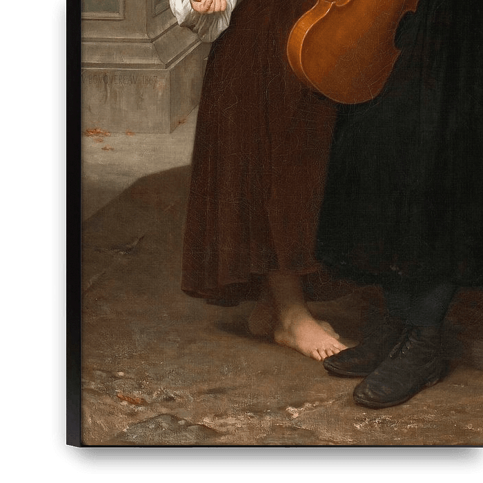 Das Bild stellt zwei Schwestern dar, die auf den Straßen Roms auftreten und betteln - ein bewegendes zeitgenössisches Thema, wie es Mitte des 19. Jahrhunderts in Mode war. Obwohl der Ausdruck des jüngeren Mädchens die Emotionen des Betrachters ausnutzen soll, neigen die klassisch inspirierte architektonische Kulisse und die sorgfältig arrangierten Posen dazu, das Thema zu idealisieren und zu veredeln, um zu vermeiden, dass die Sensibilität mit der Schmutzigkeit der tatsächlichen Armut beleidigt wird.
