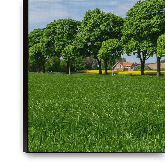 Idyllisches Landschaftsbild, mit grünem Getreidefeld, einer Kugelahornallee und leuchtend gelben Rapsfeld im Hintergrund. Hellblauer Himmel und Federwolken runden das Bild ab.