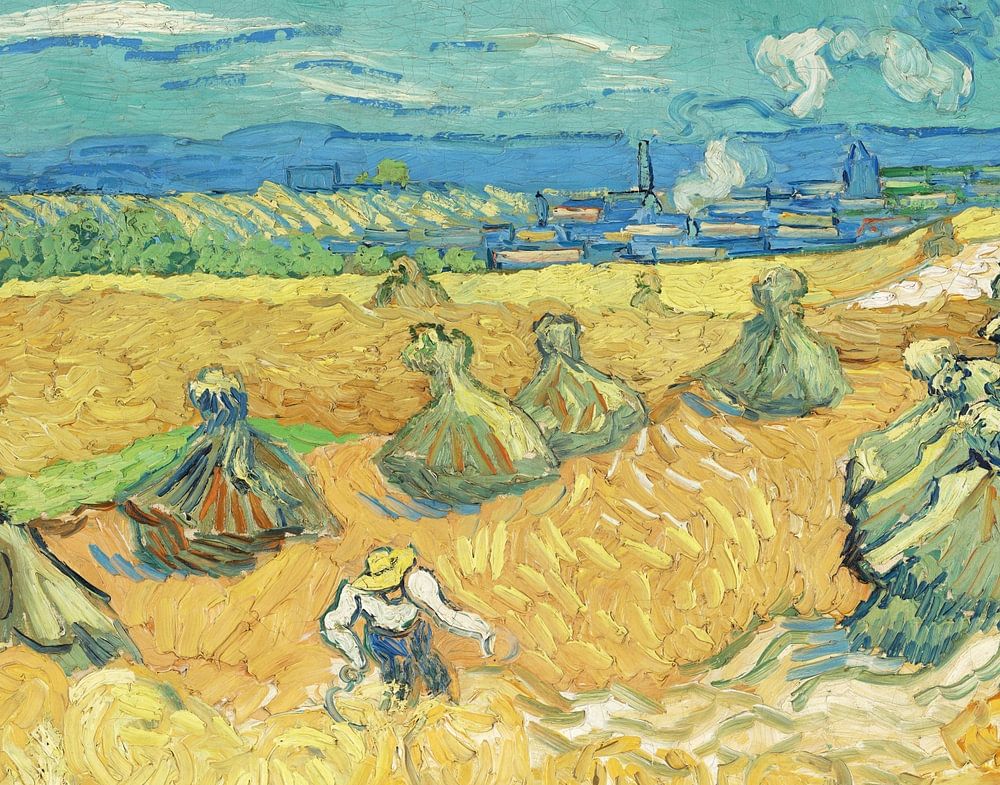 Vincent van Gogh war fasziniert von den riesigen Weizenfeldern oberhalb von Auvers-sur-Oise, einer Stadt nördlich von Paris, wo er die letzten zwei Monate seines Lebens verbrachte. Er malte viele Ansichten dieser Felder, darunter auch diese Landschaft mit einem Schnitter, der das goldene Korn schneidet, während die gestapelten Garben in Richtung eines Dorfes und der blauen Hügel in der Ferne verschwinden. Für Van Gogh war der Schnitter manchmal eine biblische Metapher für die letzte Ernte, wenn die Menschheit wie reifer Weizen geerntet wird.