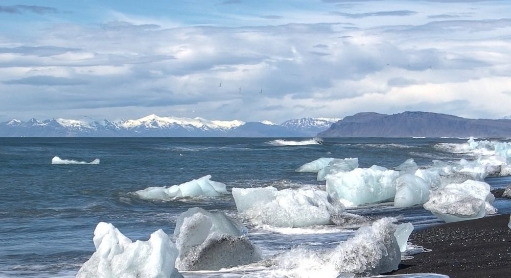 An der Küste in der Nähe des Gletschersees Jökulsárlón treiben die Eisplatten ins Meer, wo sie mehrmals an den schwarzen Strand gespült werden.