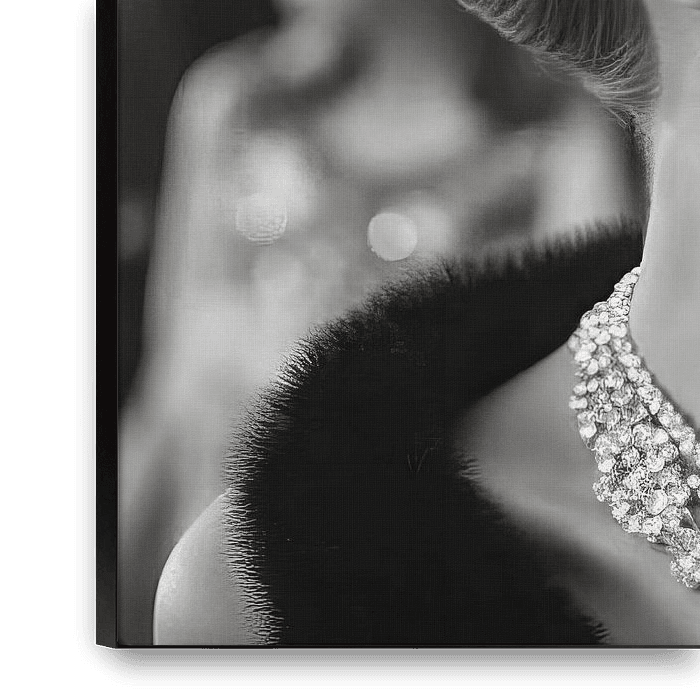 Janes Schwarz-Weiß-Porträt ist eine faszinierende Darstellung der weltgewandten, klassischen Schönheit aus den 1960er Jahren, angereichert mit der Eleganz der Haute Couture. Das Bild fängt ihre raffinierten Gesichtszüge und ihre anmutige Haltung ein, während subtile Schatten ihre zeitlose Attraktivität unterstreichen.