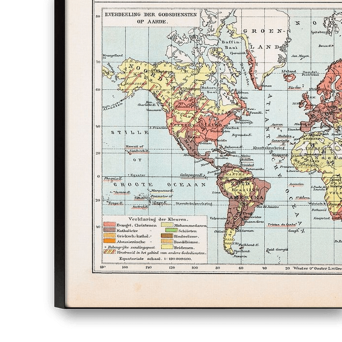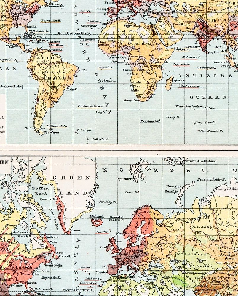 Dieses große Blatt zeigt zwei Weltkarten. Die obere Karte zeigt die Bevölkerungsdichte auf der Erde um 1900. Die untere Karte zeigt die Verteilung der Religionen auf der Erde. Es handelt sich um eine antike Karte aus dem frühen 20. Jahrhundert. Die Karte ist in Farbe.