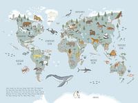 Bestelle diese Illustration Weltkarte der Tiere bleu von Marion Lesnik als Kunstdruck auf Leinwand, Alu-Dibond, als Poster, Fototapete oder Acrylglasbild.