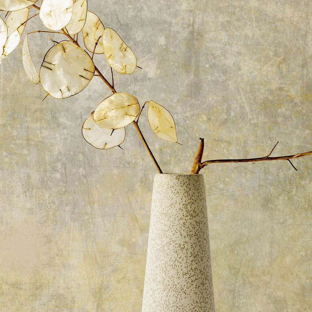 Einfaches Stillleben mit Vase und Judas-Medaillon.
