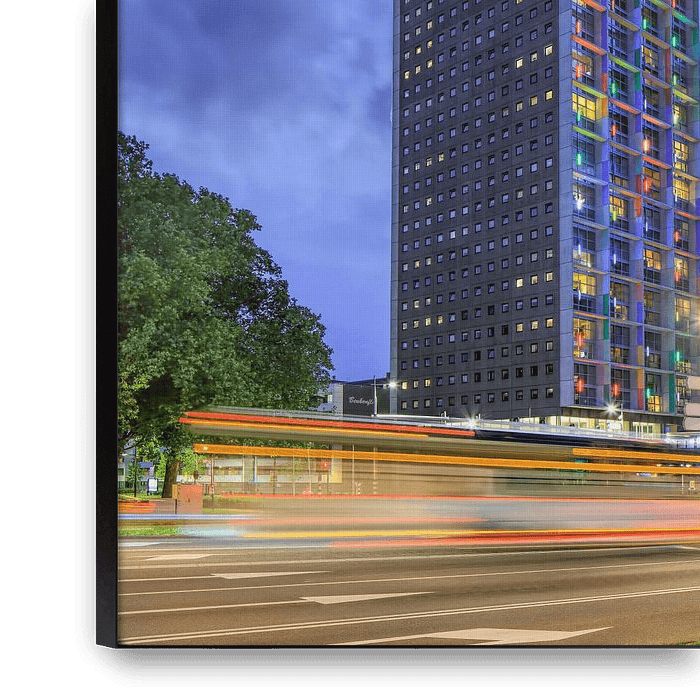 Bestelle das digitale Kunst Bild West Point Wohnturm in der Dämmerung, Tilburg von Tony Vingerhoets als Reproduktion auf Leinwand, Alu-Dibond, als Poster, Fototapete oder Acrylglasbild.