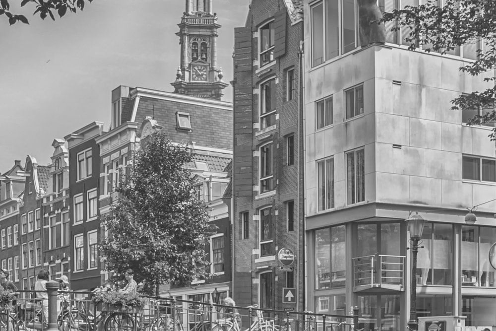 Der weltberühmte Westturm in Amsterdam von der Bloemgracht aus gesehen. Im Vordergrund Bäume mit frischem grünem Blatt und wunderschönen Kanalhäusern.