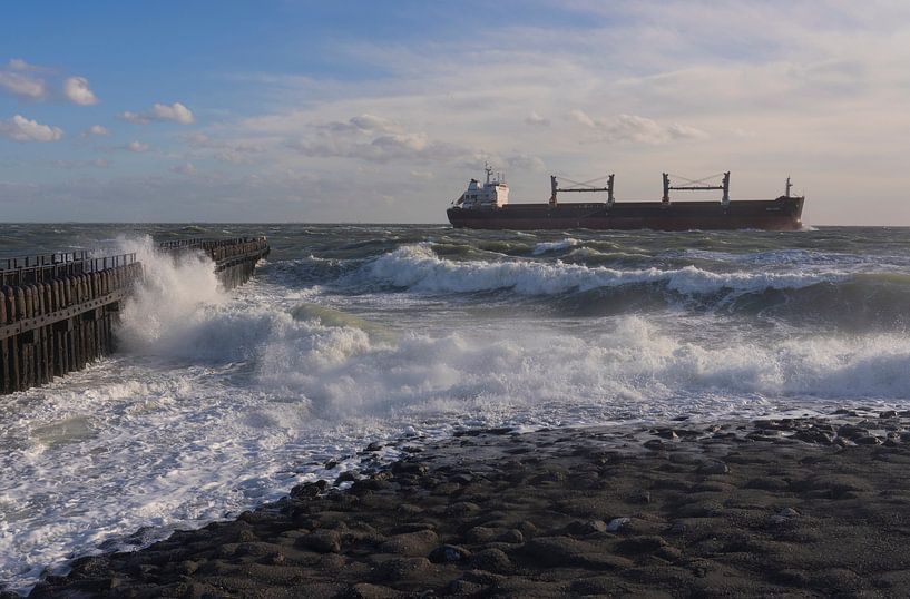 An einem windigen Tag passiert ein Schiff die Küste bei Westkapelle, wobei die Mole ständig von einer entgegenkommenden Welle begraben wird.