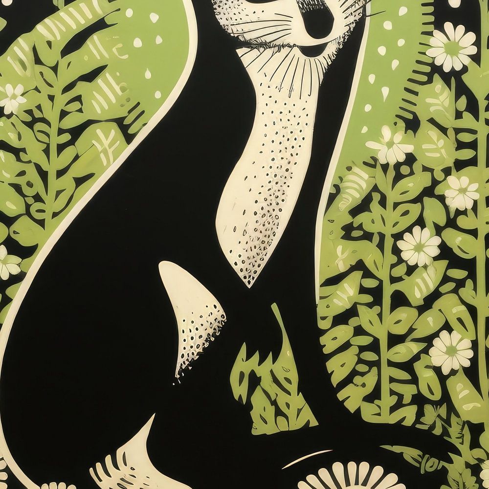 Ein Frettchen sitzt aufrecht in einem nächtlichen Garten, während hinter seinem Kopf ein blasser Heiligenschein leuchtet. Hohe Blumen und Blätter erheben sich wie schlanke Totems, ihre Formen wiederholen sich und bilden einen sanften Rhythmus um die Figur. Die Maske und die Brust sind mit kurzen geätzten Linien modelliert, und gepunktete Passagen ziehen sich entlang des Körpers, um ein Funkeln ohne Geräusche hinzuzufügen. Der dunkle Grund lenkt die Aufmerksamkeit auf die klare Silhouette und das helle Auge, so dass das Werk aus der Ferne kraftvoll wirkt und bei näherer Betrachtung mit gemessenen Texturen und weicher Maserung belohnt.