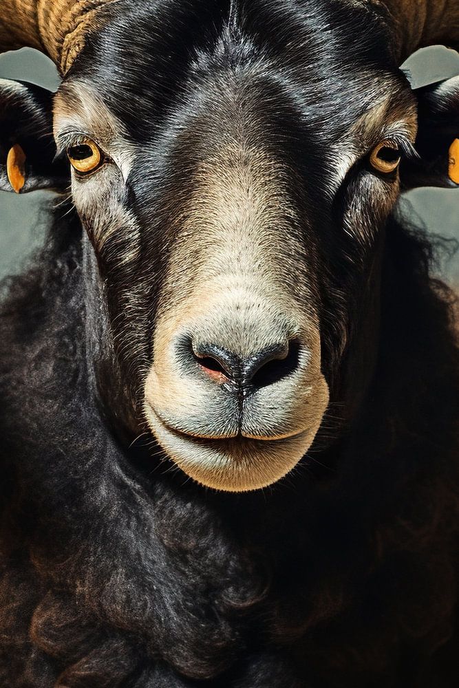 Widderporträt | Stille Majestät - Das Gemälde zeigt einen majestätischen Widder in Nahaufnahme, mit beeindruckenden, gedrehten Hörnern und einem tiefschwarzen Fell, das die Textur des Tieres betont. Diese detaillierte Darstellung vor einem vagen, neutralen Hintergrund schafft ein lebendiges und natürliches Porträt, das sowohl rustikal als auch raffiniert wirkt.