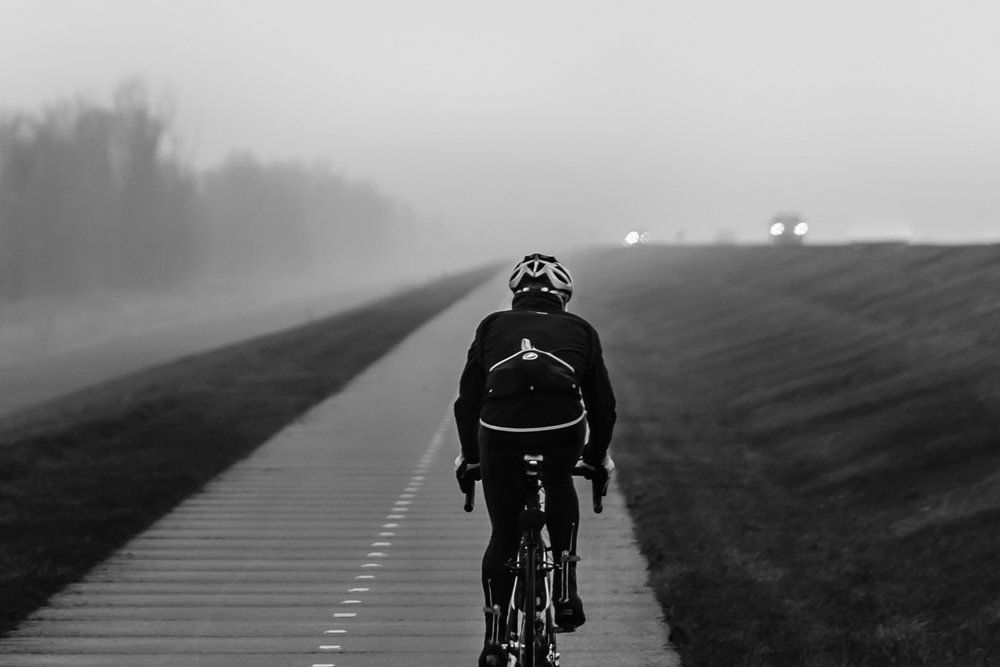 ..ist das einsame Radfahrer, kämpfend auf einem Deich ohne sichtbares Ende. Nebelig und verlassen. Darstellung des niederländischen Bestimmung.