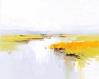 Weide - Dit is een helder, ademend landschap waarin twee dingen meteen je aandacht grijpen: een brede, stille waterpartij die als een spiegel het midden van het doek doorsnijdt, en een vlammende gele weide rechtsvoor die in dikke, zekere toetsen is neergezet. De lucht bovenin is vrijwel wit, een zachte, diffuse gloed die het licht lijkt te houden en daardoor de spiegeling in het water extra laat spreken. Het water is niet gedetailleerd — het is een brede baan van zachte overgangen en reflecties, waarin het wit van de hemel en de omliggende kleuren samenkomen tot één rustige spiegeling. Deze compositie — grote lege lucht, lage horizon, brede spiegelende waterstroom — geeft direct ruimte en rust: een landschap dat ademt.