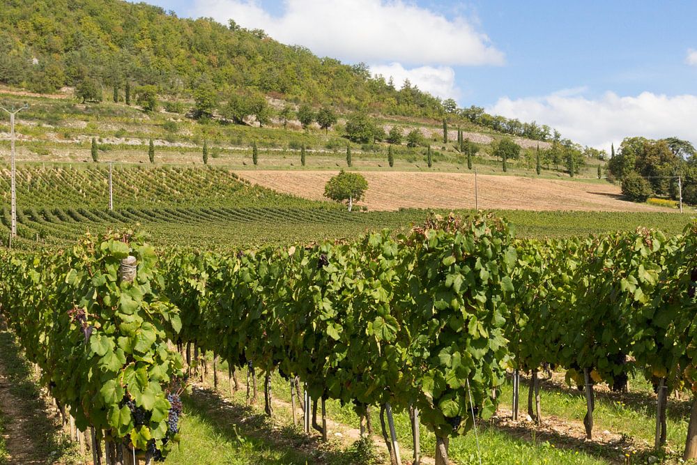 Frankrijk, het land van wijn! Prachtige streek (Dordogne/Lot) waar veel wijngaarden te vinden zijn. Mooie overzichtsfoto met het landschap op de achtergrond.