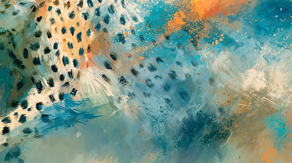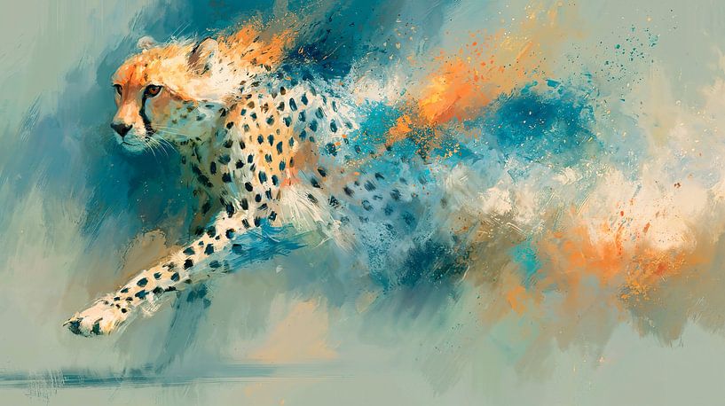 Ein dynamisches Kunstwerk, das einen Geparden im vollen Sprint zeigt und Geschwindigkeit und Bewegung perfekt wiedergibt. Der Hintergrund besteht aus abstrakten, spritzigen Pinselstrichen, die eine energiegeladene und lebendige Atmosphäre schaffen, welche Bewegung und Freiheit unterstreicht. Die Komposition hat eine lebendige,…