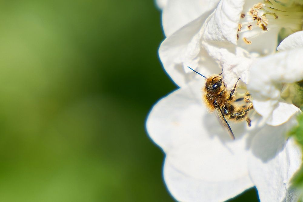 fleißige Wildbiene während der Bestäubung an einer Apfelbaum Blüte im Frühling auf einer Streuobstwiese in Deutschland