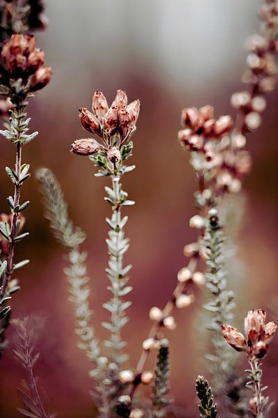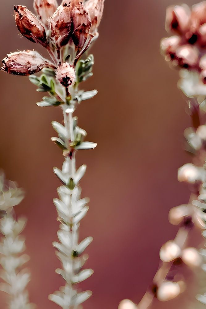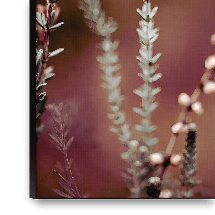 Eine warme und sanfte botanische Makrofotografie, in der zarte Wildblumenstiele subtil ins Bild treten, eingehüllt in eine traumhafte Unschärfe. Die zarten Formen und die leichte Unschärfe verleihen dem Bild eine ruhige und fast ätherische Ausstrahlung, als ob der Moment für einen kurzen Augenblick stillstehen geblieben wäre. Die Farben…