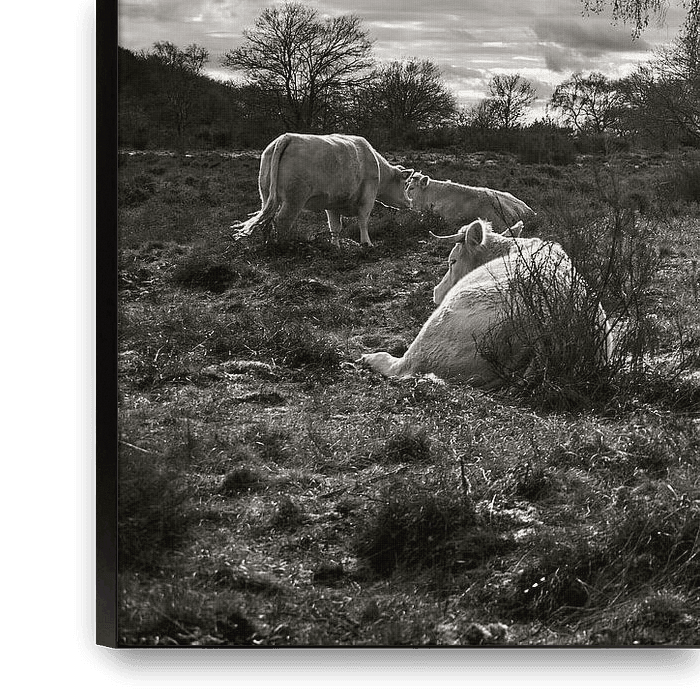 Bestelle dieses Landschafts-Wandbild Wilde Rinder, Hoorneboegse Heide, Hilversum von André Bouterse als Reproduktion auf Leinwand, Alu-Dibond, als Poster, Fototapete oder Acrylglasbild.