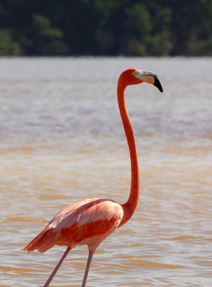 Wilder Flamingo in der Nähe des Mangrovenwaldes in Celestún, Mexiko. einer der wenigen Orte auf der Welt, wo Flamingos leben.