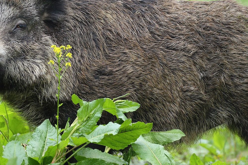 Das Wildschwein (Sus scrofa) ist ein robustes, allesfressendes Säugetier und der wilde Vorfahre des Hausschweins. Das Tier hat einen kräftigen Körperbau, eine kurze Schnauze und ein dichtes, borstiges Fell, das von grau-braun bis schwarz reicht. Ausgewachsene männliche Tiere haben sichtbare Stoßzähne, die als Verteidigungswaffe dienen und bei der Nahrungssuche helfen.