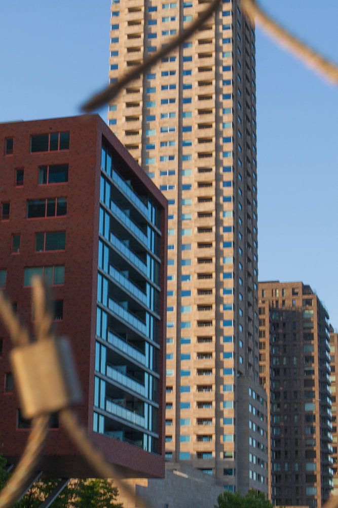 Die Wohntürme auf dem Wilhelminapier in Rotterdam. Von der Rijnhavenbrücke aus gesehen von Katendrecht
