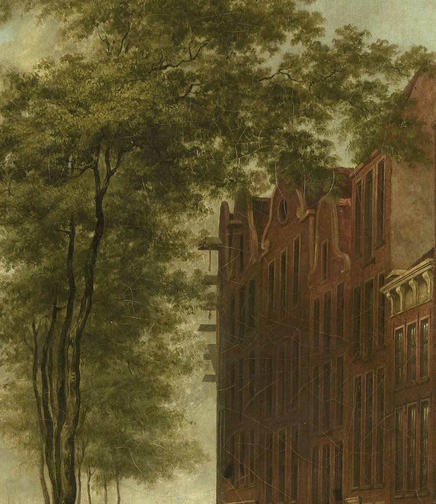 Ein Stadtbild mit typischen Amsterdamer Gebäuden und Schiffen im Hafen im Hintergrund.