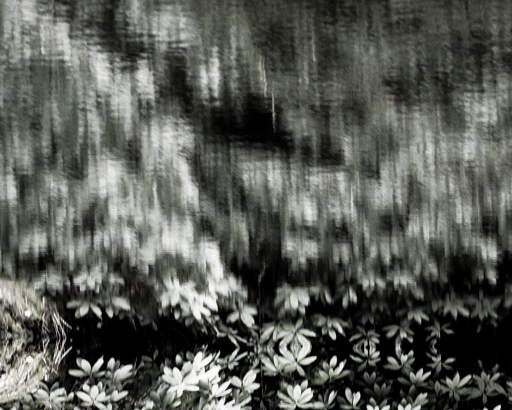 Ein schwarz-weißes abstraktes realistisches Foto einer Reflexion im Wasser, mit einer Illusion von Wind und Regen.
