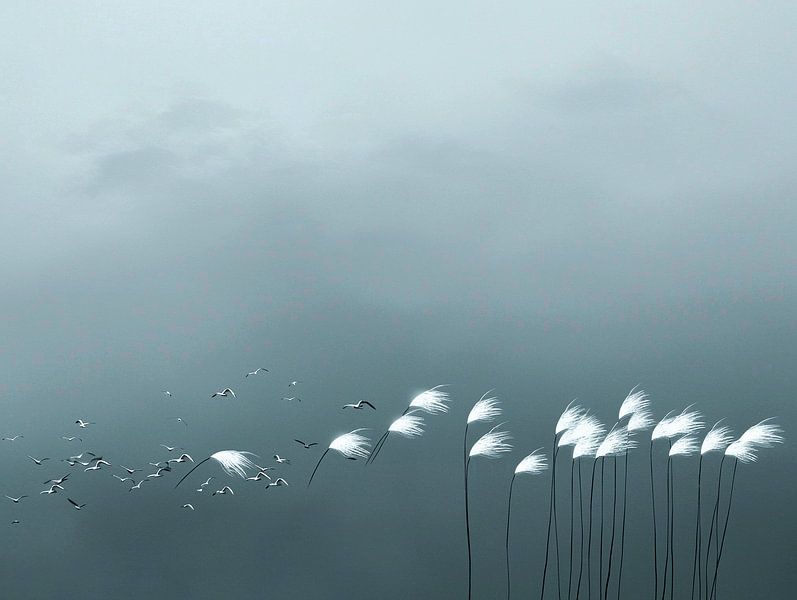 Minimalistische digitale Kunst einer ruhigen, nebligen Landschaft mit flauschigem weißem Samenflaum auf dünnen Stängeln und einem Vogelschwarm, der vor einem weichen graublauen Hintergrund auffliegt.