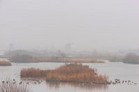 Mist in de ochtend aan de kinderdijk laat de daar staande windmolens mooi uitkomen in het landschap.