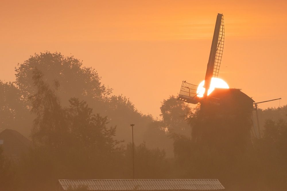 Foto einer Mühle in Drenthe, in der Nähe von Beilen, bei Sonnenaufgang. Die Sonne geht auf und erscheint hinter der Mühle. Es ist ein nebliger Morgen im Sommer. So sehr früh, aber so schön und friedlich. Der Himmel färbt sich orange. Die Mühle steht inmitten von Büschen und Bäumen.