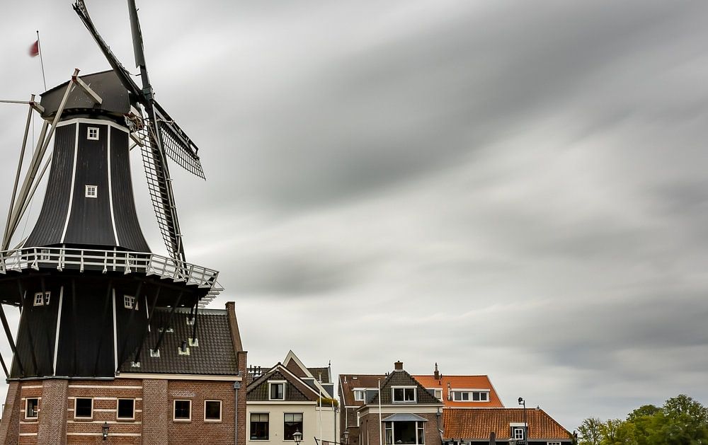 Die Mühle de Adriaan an einem bewölkten Tag.