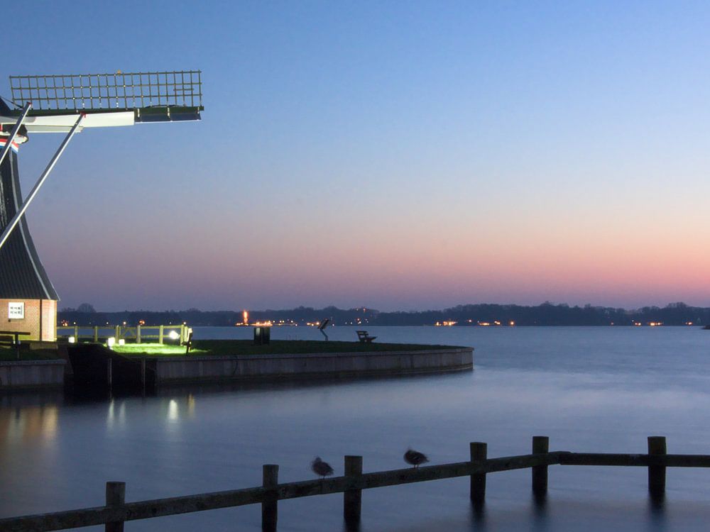 Schöne beleuchtete Windmühle auf einem See. Durch das glatte Wasser und die dunkle Umgebung strahlt das Bild Ruhe aus.