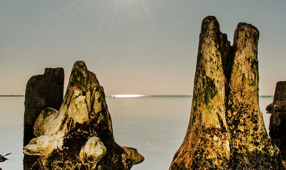 Vergane golfbrekers op het IJsselmeer nabij Gaast op een windstille dag