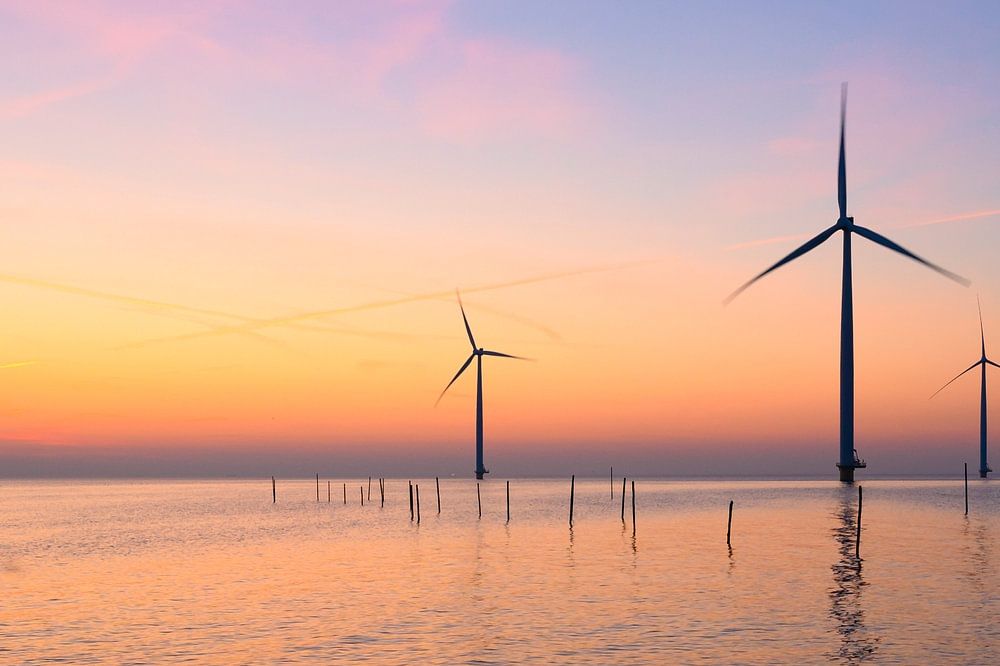 Windturbinen zur Erzeugung nachhaltiger erneuerbarer Energie in einem Offshore-Windpark in Flevoland, Niederlande. Blick aus der Drohne.