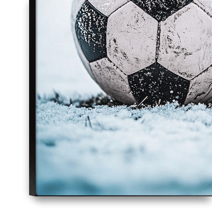 Eine ikonische Nahaufnahme eines schwarz-weißen Fußballs, der mit feinen Schneeflocken bedeckt ist. Die Winterlandschaft schafft eine rustikale und heitere Atmosphäre, perfekt für Sport- und Naturliebhaber. Dieses Design strahlt Schlichtheit und Stärke aus und eignet sich daher ideal als Wanddekoration in verschiedenen Räumen wie einem…